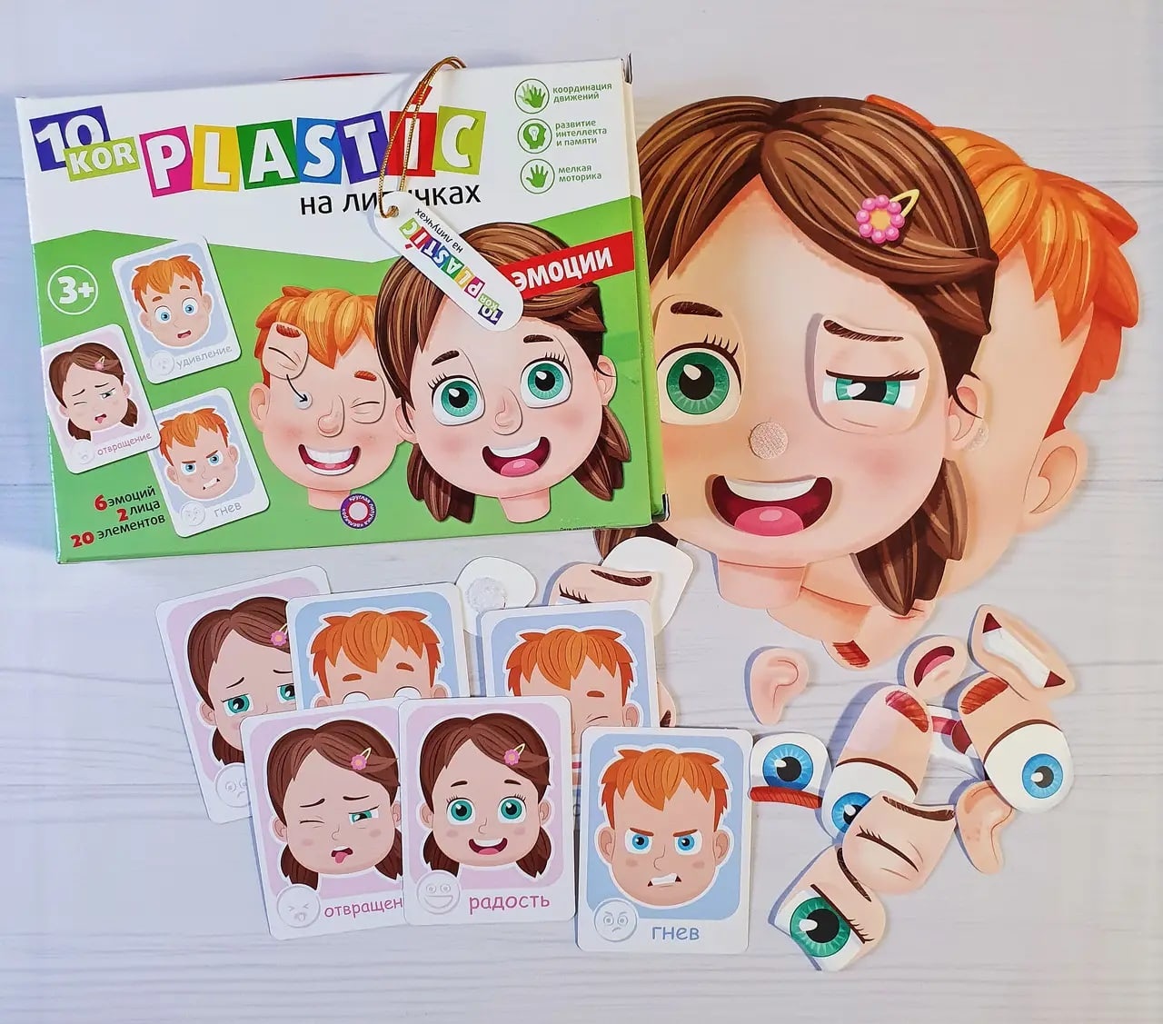 В набор входит 2 карточки (лицо мальчика и девочки), 20 элементов на липучках и 6 карточек с изображениями эмоций.